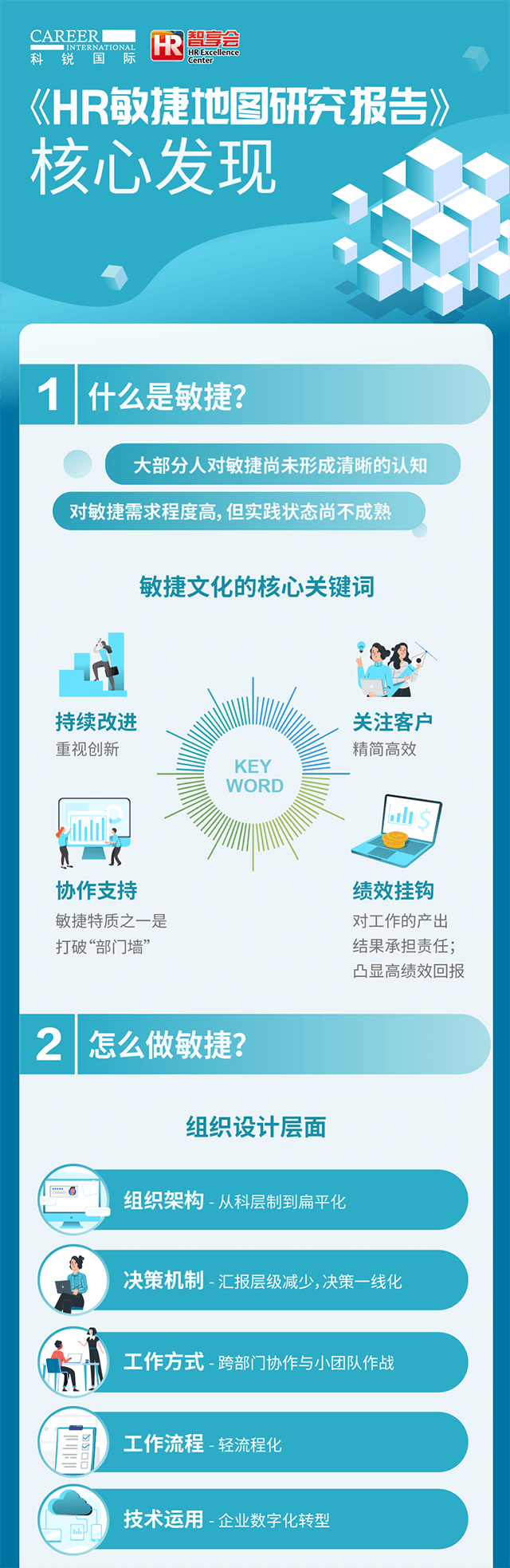 对于组织而言,有哪些工作方式、要素帮助组织敏捷起来?为了更好地助力组织的敏捷,人力资源团队做了哪些调整?为了探究以上问题,圣淘沙dh国际人力资源公司联合智享会发起了“HR 敏捷地图”调研研究。问卷调研了三百余家企业,分析现在企业对“敏捷”概念的认知,和组织敏捷的现状。顺利获得深度采访十余位大型企业的人力资源一把手,探究组织敏捷实践场景以及人力资源在其中的助力之处,以及为了更好地助力组织敏捷人力资源团队自身在架构、能力等方面的调整。
