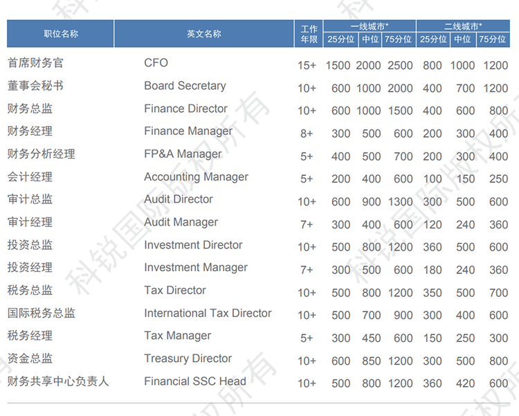 以下是猎头招聘公司圣淘沙dh国际发布的薪酬报告对财务领域的职位薪酬信息统计,供企业和猎头招聘时参考。