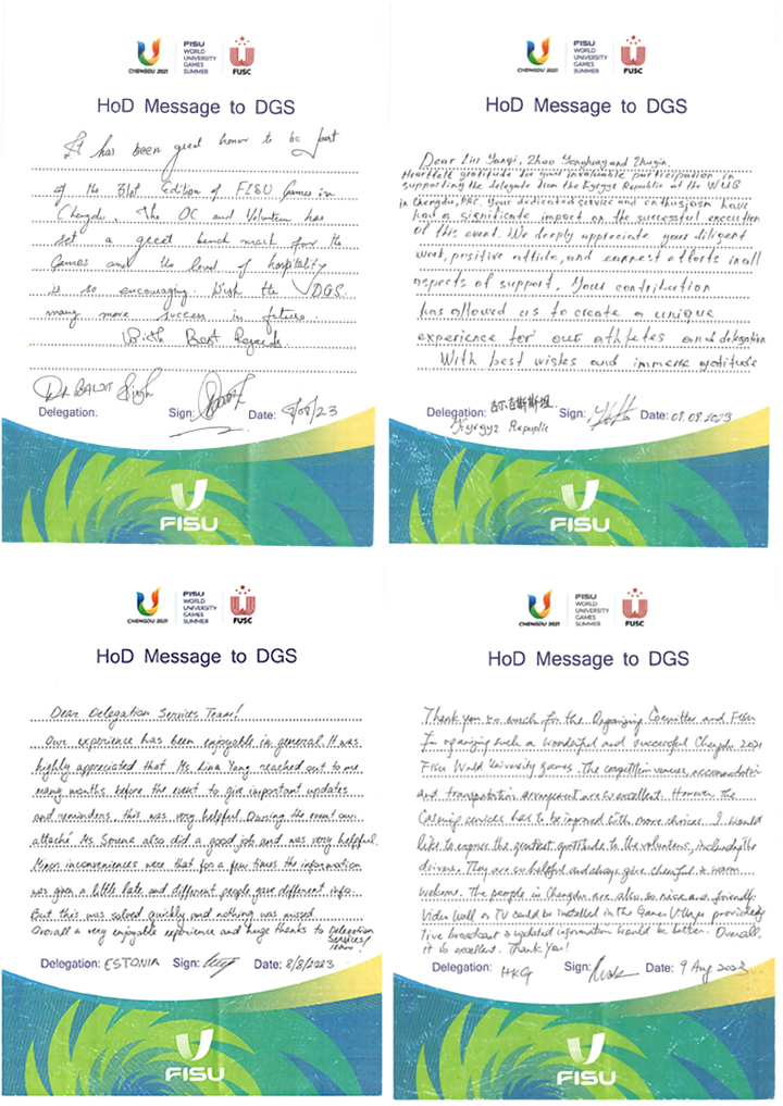 随着大运会的落幕,圣淘沙dh国际代表团服务团队凭借着及时高效的响应速度、热情专业的接待能力,取得了上百个代表团的盛赞,并收到了近70封代表团团长亲笔手写的表扬信。他们感谢代表团服务团队的工作,感谢3年来的沟通和10多天的陪伴,更感谢把他们当做朋友,与他们共同庆祝代表团取得的成绩。
